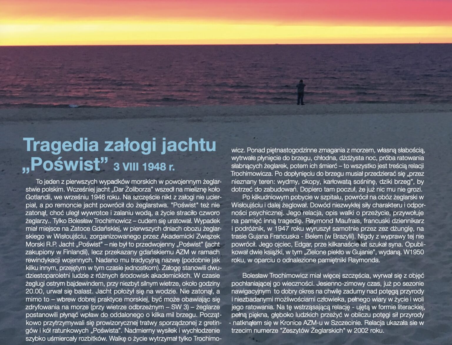 Bolesław Trochimowicz miał więcej szczęścia, wyrwał się z objęć pochłaniającej go wieczności. Jesienno-zimowy czas, już po sezonie nawigacyjnym to dobry okres na chwilę zadumy nad potęgą przyrody i niezbadanymi możliwościami człowieka, pełnego wiary w życie i woli jego ratowania. Na tę wstrząsającą relację – ujętą w formie literackiej, pełną piękna, głęboko ludzkich przeżyć w obliczu potęgi sił przyrody natknąłem się w Kronice AZM-u w Szczecinie. Relacja ukazała się w trzecim numerze „Zeszytów Żeglarskich” w 2002 roku.