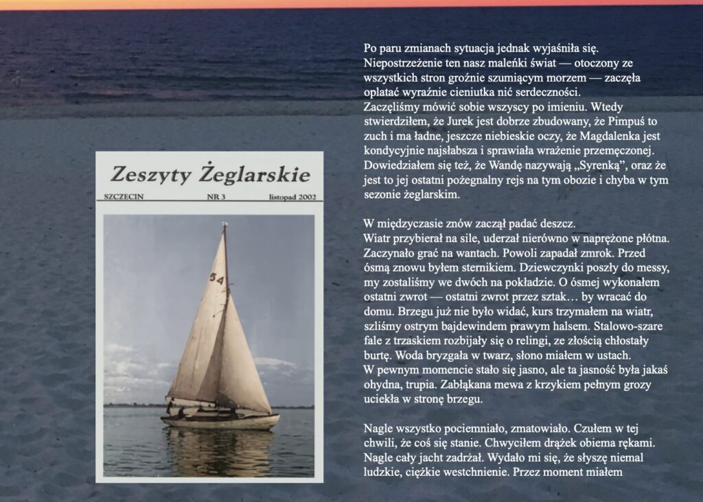 Wiatr przybierał na sile, uderzał nierówno w naprężone płótna. Zaczynało grać na wantach. Powoli zapadał zmrok. Przed ósmą znowu byłem sternikiem. Dziewczynki poszły do messy, my zostaliśmy we dwóch na pokładzie. O ósmej wykonałem ostatni zwrot — ostatni zwrot przez sztak… by wracać do domu. Brzegu już nie było widać, kurs trzymałem na wiatr, szliśmy ostrym bajdewindem prawym halsem. Stalowo-szare fale z trzaskiem rozbijały się o relingi, ze złością chłostały burtę. Woda bryzgała w twarz, słono miałem w ustach.