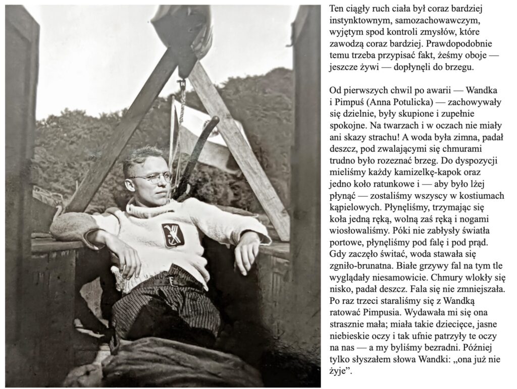Ten ciągły ruch ciała był coraz bardziej instynktownym, samozachowawczym, wyjętym spod kontroli zmysłów, które zawodzą coraz bardziej. Prawdopodobnie temu trzeba przypisać fakt, żeśmy oboje — jeszcze żywi — dopłynęli do brzegu. Od pierwszych chwil po awarii — Wandka i Pimpuś (Anna Potulicka) — zachowywały