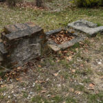 Wracam do furty. Po prawej stronie ścieżki dostrzegam fragment muru osadzonego na fundamencie, może narożnik dawnego budynku. Tuż obok obmurowany z cegły otwór, a nieopodal kamienna misa, zapewne umieszczona kiedyś pod wylotem rynny, z odpływem deszczówki do zbiornika albo basenu. Typowe rozwiązanie dawnych niemieckich obejść. Znam je dobrze.