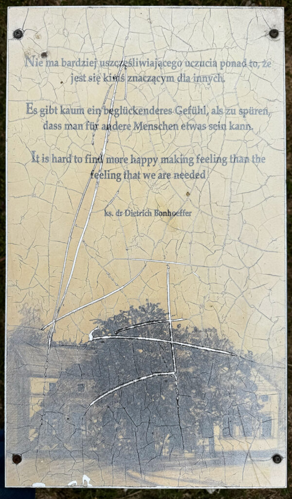 Organizatorzy Ogrodu Ciszy i Medytacji postanowili więc — i słusznie — uczynić z tego miejsca coś więcej niż park z pamiątkowym głazem i tablicami. Chcieli — wzdłuż szutrowej ścieżki — wytyczyć intelektualną drogę krzyżową pytań pastora. Na powyginanych, spłowiałych niemal do nieczytelności tablicach umieszczono także cytaty z Bonhoeffera. Nie były to tylko informacje o tym, co tu kiedyś było, lecz także inspiracje do rozważań, wezwania do zatrzymania się i próby nawiązania rozmowy.